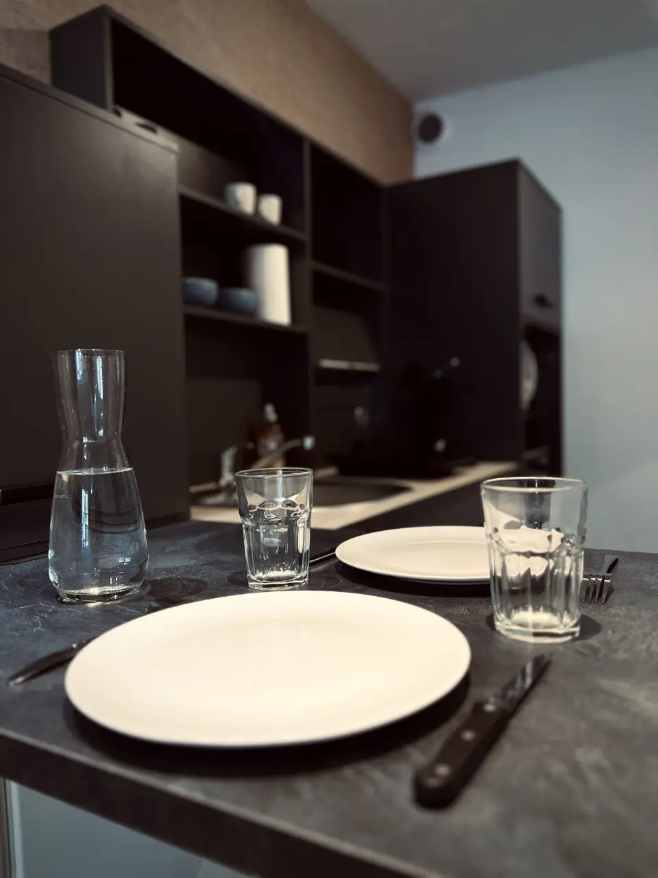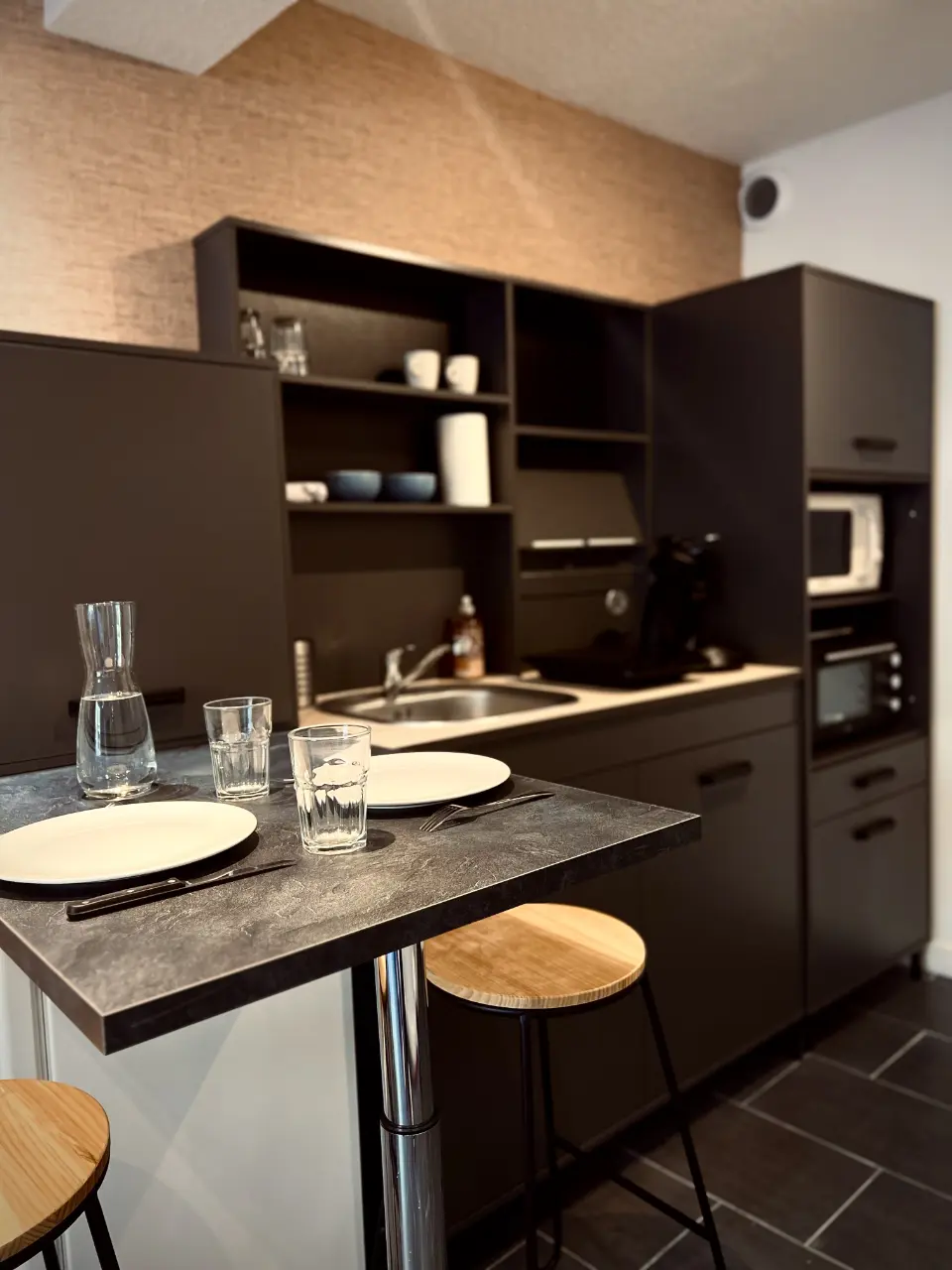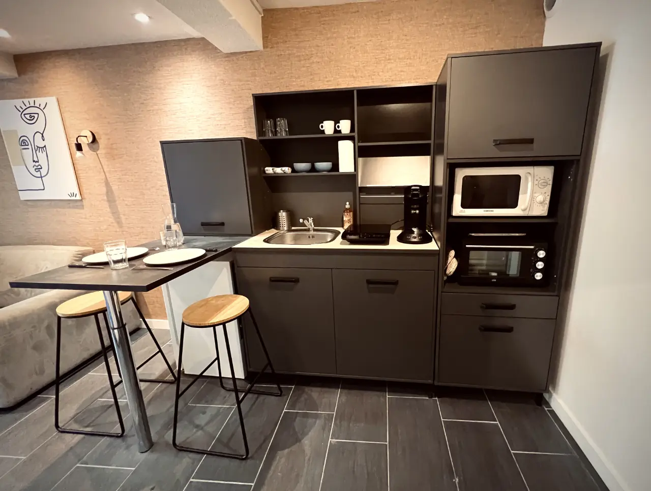 La cuisine est équipée d'un four à micro-ondes, une plaque de cuisson, un réfrigérateur, une cafetière Senseo mais aussi un grille-pain et que tous les ustensiles de cuisine dont vous pouvez avoir besoin.